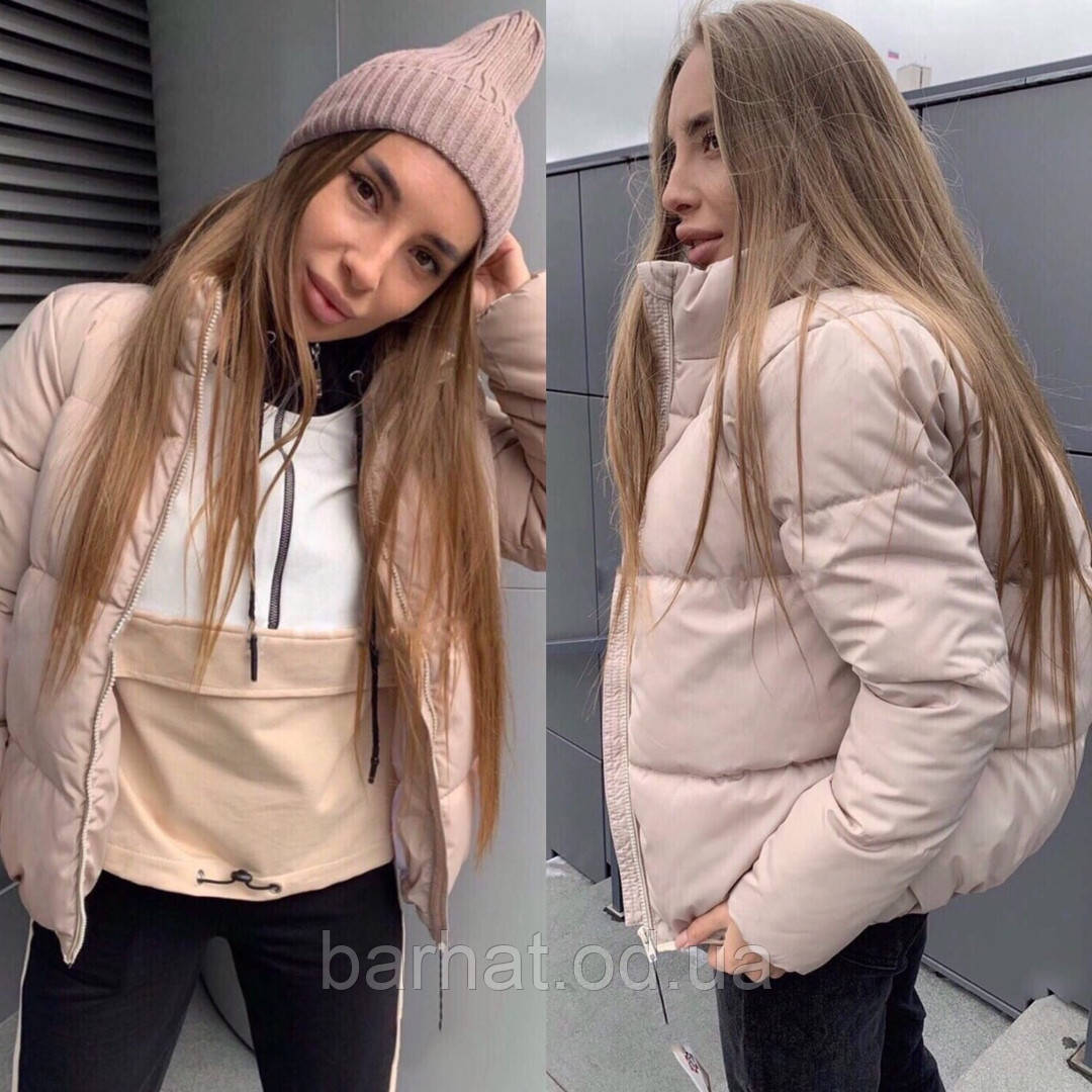 Стігана об'ємна куртка, в бічних швах потайні кишені, манжет рукава та низ куртки на гумці, яка оброблена стрейчевою стрічкою